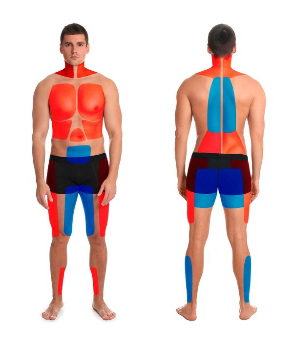Bodies that sat with a tucked pelvis in a chair for decades have obvious shared patterns where the muscle is shortened (red) or overstretched (blue).