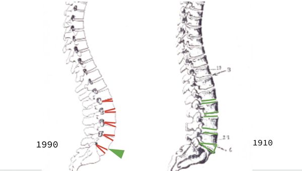 The far left image shows how even 30 years ago, before cell phones, the bones of the "average" spine were pinching disc and nerve tissue compared to the 1910 medical text book illustration where bones have safe and aligned room for these tissues.