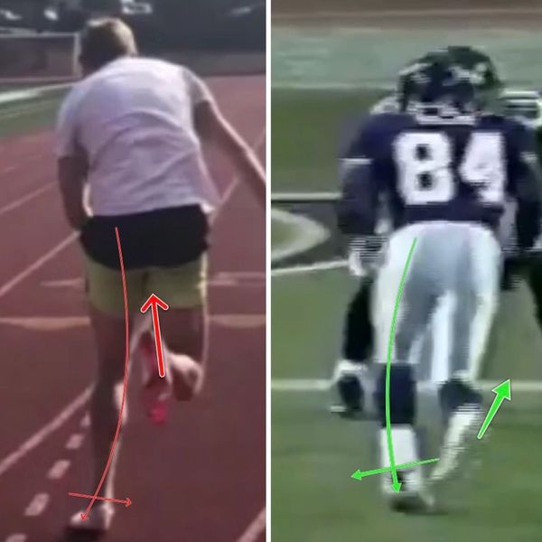 This one-legged athlete HAS to use the most efficient movement patterns to run. See how the knee bows OUT towards the outside edge of the foot when he lands and flicks IN when he pushes.